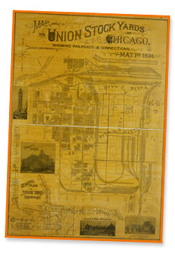 Uncle John went into his desk drawer and shuffled through papers until he found what he was looking for. "This is a map of the stockyards from when I was a boy. It shows how all the railroads connected. Look at how big the Union Stock Yard was."