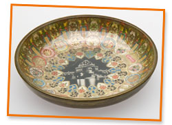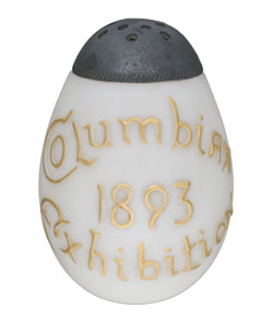 They walked the whole length of the giant Manufactures Building, and by the time they reached the far end, they were tired. Grandpa stopped at a stand run by two men from Austria and bought sausages on a roll with pickles, peppers, onions, mustard, and relish and a new kind of drink to share. It was filled with bubbles that tickled Joseph and Lily's mouths and made them giggle and burp. Lily spotted a souvenir for her mother, an egg-shaped salt and pepper shaker set with "1893 Columbian Exposition" in raised gold letters. Grandpa gave her money to buy it. Then, Grandpa flagged down a man pushing a rolling chair to see if they could get a ride to the Midway.