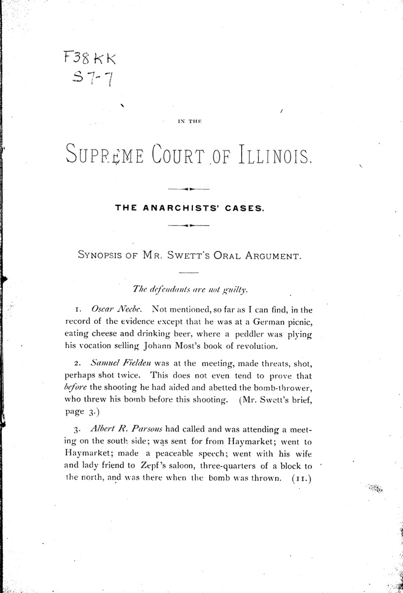 The anarchists' cases: synopsis of Mr. Swett's oral argument. Page 1 Higher Quality Image (123K) | Next Image Return to Text | Return to Published Sources TOC | Return to the HADC Table of Contents