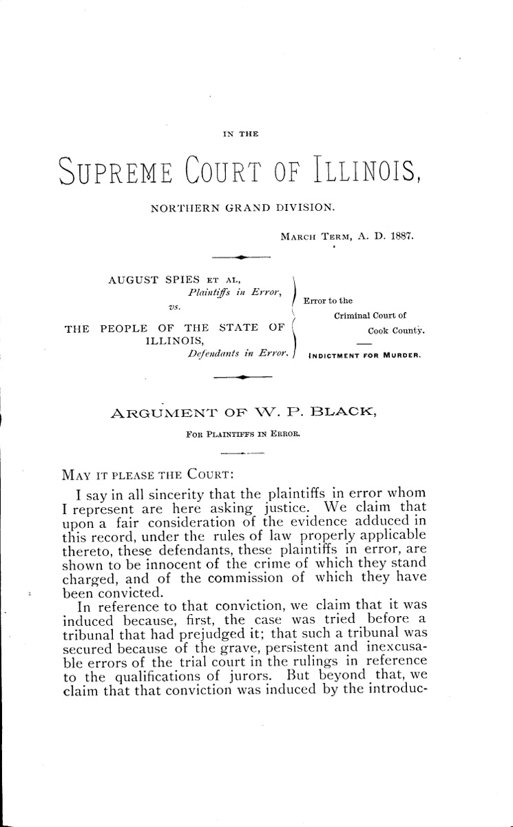 Error to the Criminal Court of Cook County: indictment for murder, oral argument of W. P. Black for plaintiffs in error. Page 1 Higher Quality Image (142K) | Previous Image | Next Image Return to Text | Return to Published Sources TOC | Return to the HADC Table of Contents
