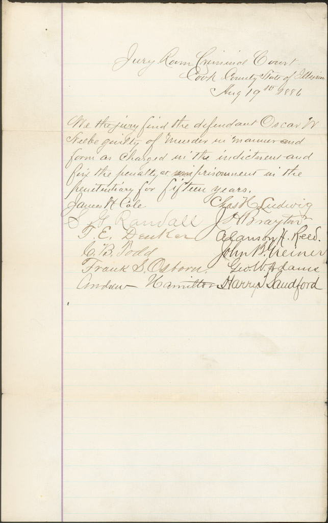 Verdict of guilty and sentence of 15 years imprisonment for Oscar Neebe, 1886 Aug. 19. Courtesy of the Clerk of the Circuit Court of Cook County Archives