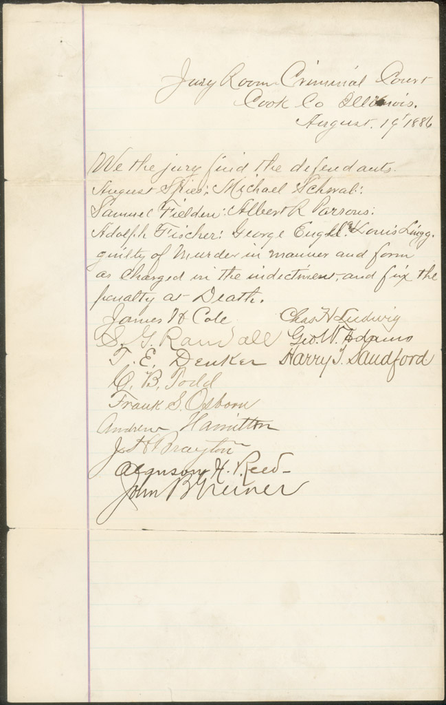 Verdict of guilty and sentence of death against August Spies et al., 1886 Aug. 19. Courtesy of the Clerk of the Circuit Court of Cook County Archives