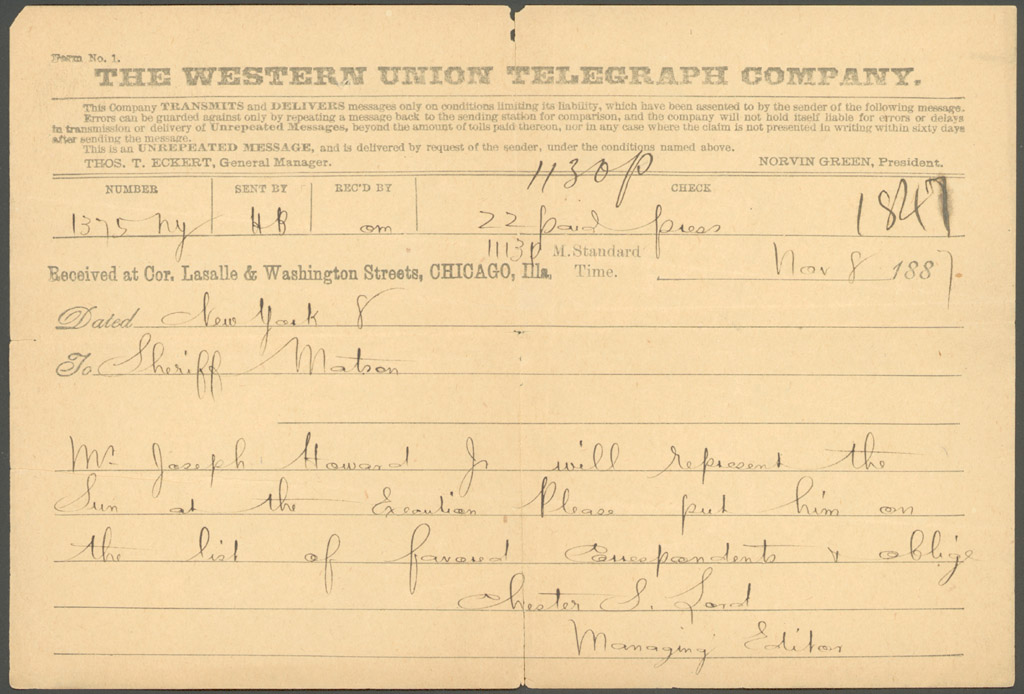 Chester S. Lord telegram to Cook County Sheriff Canute Matson, 1887 Nov. 8.