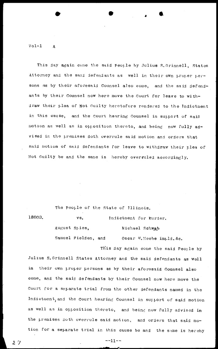 Synopses of court proceedings Volume 1, Page 27 Higher Quality Image (150K) | Previous Image | Next Image Return to Text | Return to Trial TOC | Return to the HADC Table of Contents