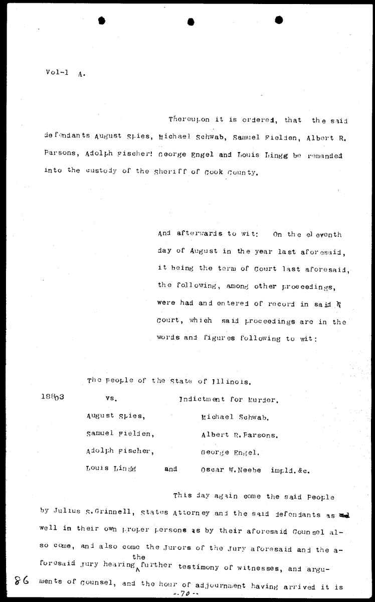 Synopses of court proceedings Volume 1, Page 86 Higher Quality Image (128K) | Previous Image | Next Image Return to Text | Return to Trial TOC | Return to the HADC Table of Contents