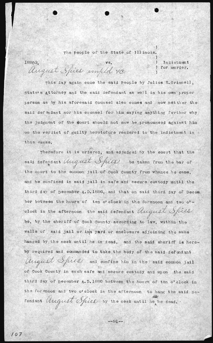 Indictment for murder with sentence against August Spies Volume 1, Page 107