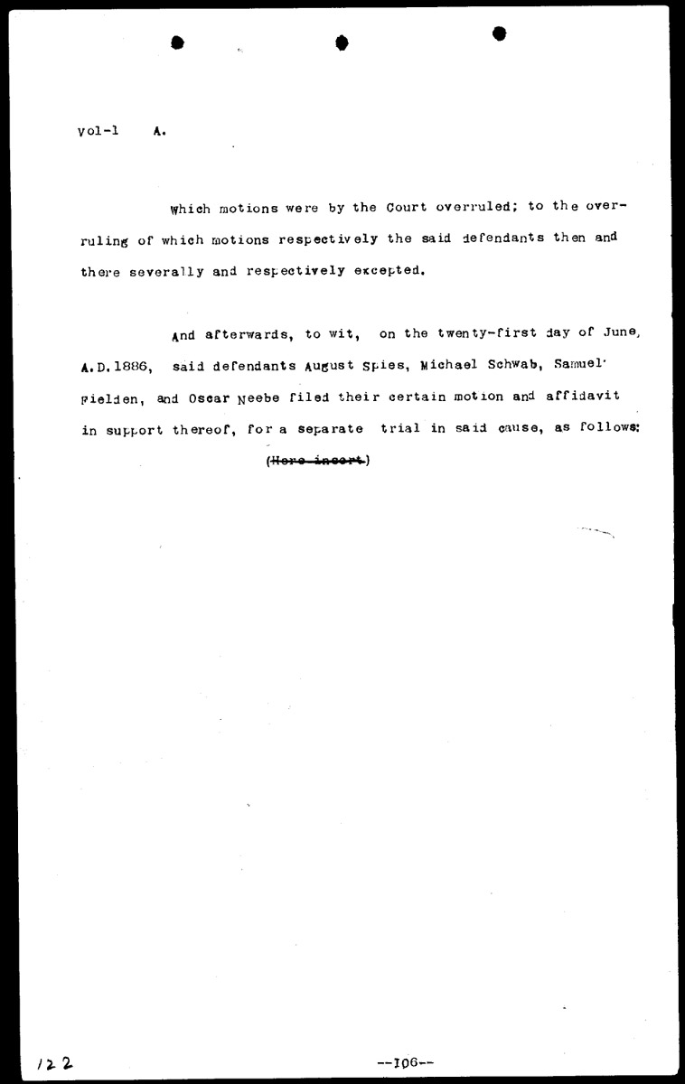 Bill of exceptions filed by counsel for the defense Volume 1, Page 122 Higher Quality Image (71K) | Previous Image | Next Image Return to Text | Return to Trial TOC | Return to the HADC Table of Contents