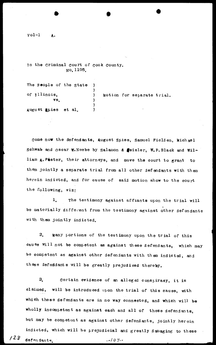 Bill of exceptions filed by counsel for the defense Volume 1, Page 123 Higher Quality Image (150K) | Previous Image | Next Image Return to Text | Return to Trial TOC | Return to the HADC Table of Contents