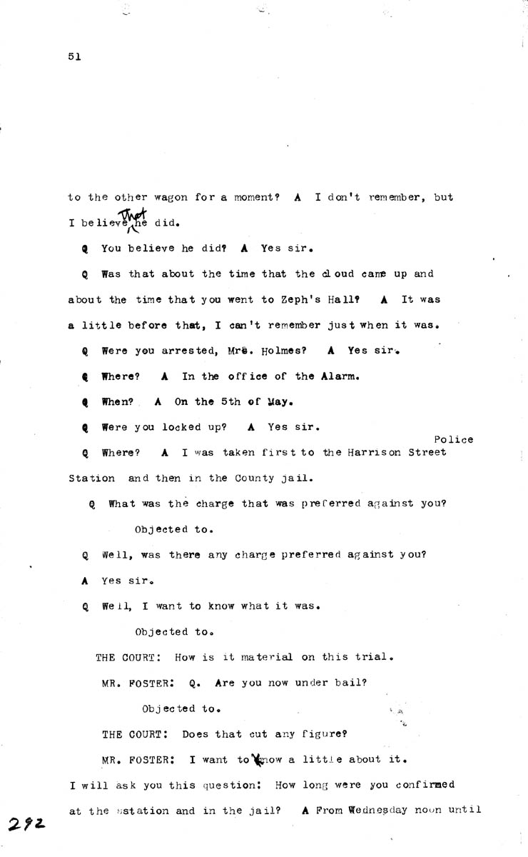 Testimony of Lizzie Mae Holmes Volume M, Page 292 Higher Quality Image (85K) | Previous Image | Next Image Return to Text | Return to Trial TOC | Return to the HADC Table of Contents