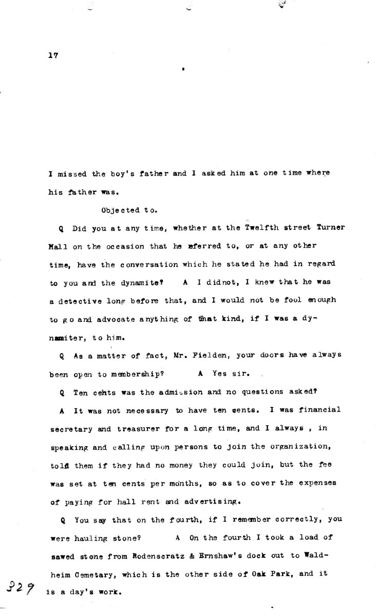 Testimony of Samuel Fielden (first appearance) Volume M, Page 329