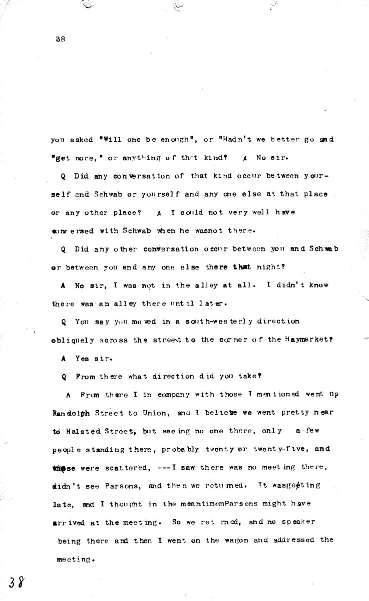 Testimony of August Spies Volume N, Page 38 Higher Quality Image (102K) | Previous Image | Next Image Return to Text | Return to Trial TOC | Return to the HADC Table of Contents