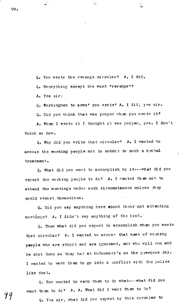 Testimony of August Spies Volume N, Page 99 Higher Quality Image (98K) | Previous Image | Next Image Return to Text | Return to Trial TOC | Return to the HADC Table of Contents