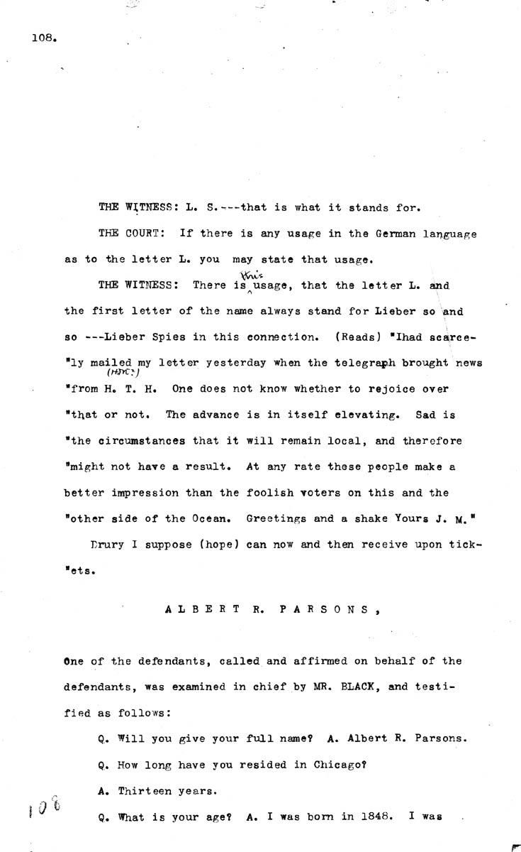 Testimony of E. F. L. Gauss (fourth appearance)Testimony of Albert Parsons Volume N, Page 108