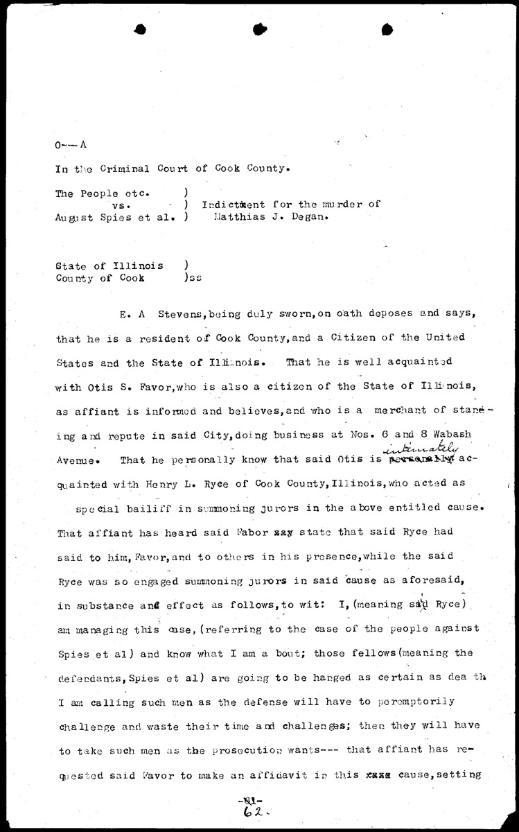 Affidavits of the defendants and E. A. Stevens: court discourse Volume O, Page 62