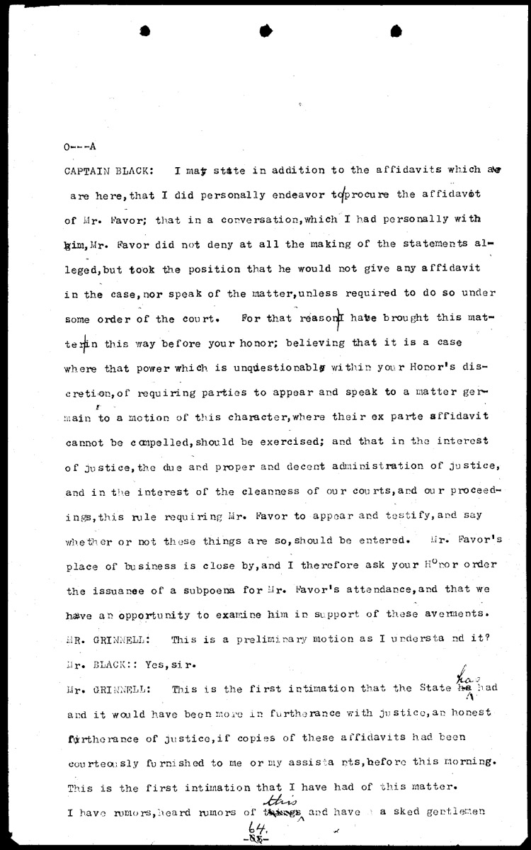 Affidavits of the defendants and E. A. Stevens: court discourse Volume O, Page 64 Higher Quality Image (195K) | Previous Image | Next Image Return to Text | Return to Trial TOC | Return to the HADC Table of Contents