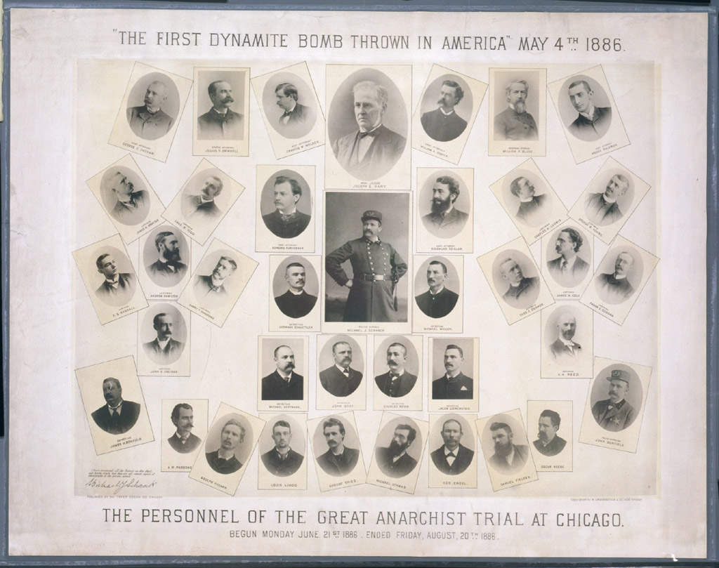 The personnel of the great anarchist trial at Chicago: the first dynamite bomb thrown in America May 4th 1886. Broadsheet containing a printed montage of individual, halftone portraits of 38 persons involved in the Haymarket Anarchists Trial, including the judge, prosecution and defense lawyers, jurors, police officers, and the defendants. A three-quarter length portrait of Captain Michael Schaack is in the center.
