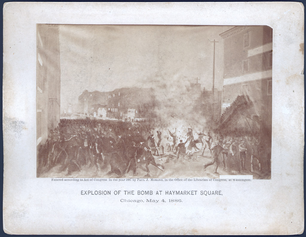 Explosion of the bomb at Haymarket Square: Chicago, May 4, 1886. Photograph of a painting of bomb exploding near the speakers' platform near Haymarket Square and throwing men into the air. The view looks toward the speakers' platform from a distance with the explosion in the foreground.