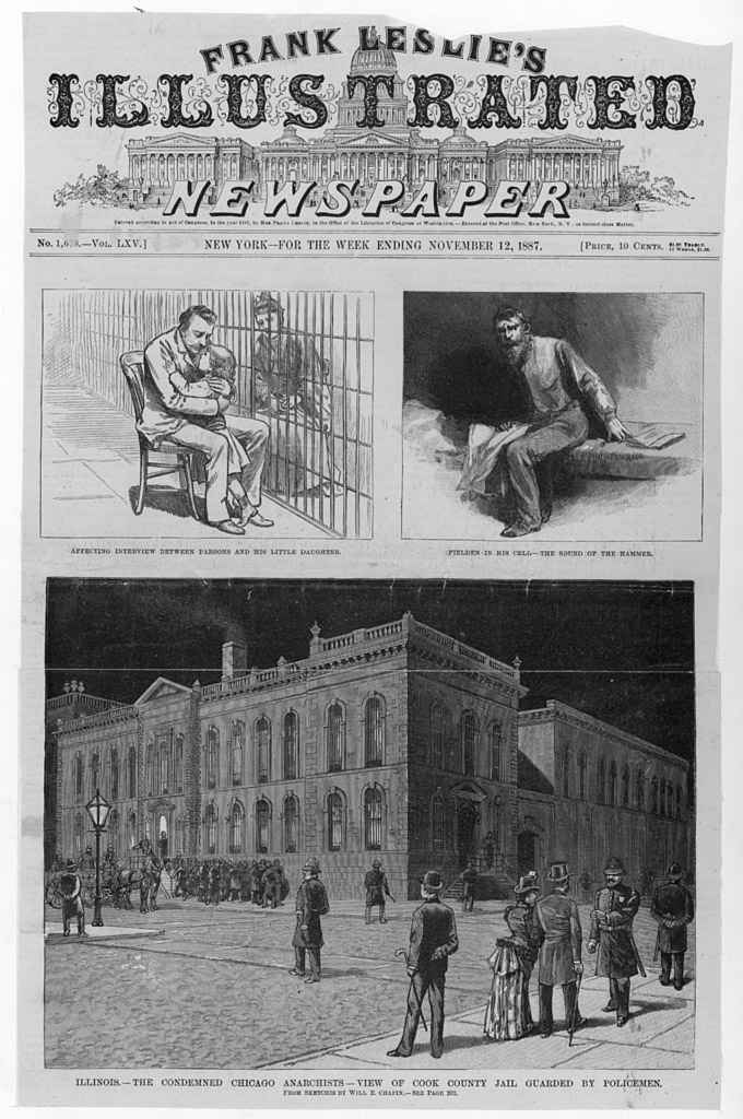 Affecting interview between Parsons and his little daughter: Fielden in his cell, the sound of the hammer; the condemned Chicago anarchists, view of Cook County Jail guarded by policemen.