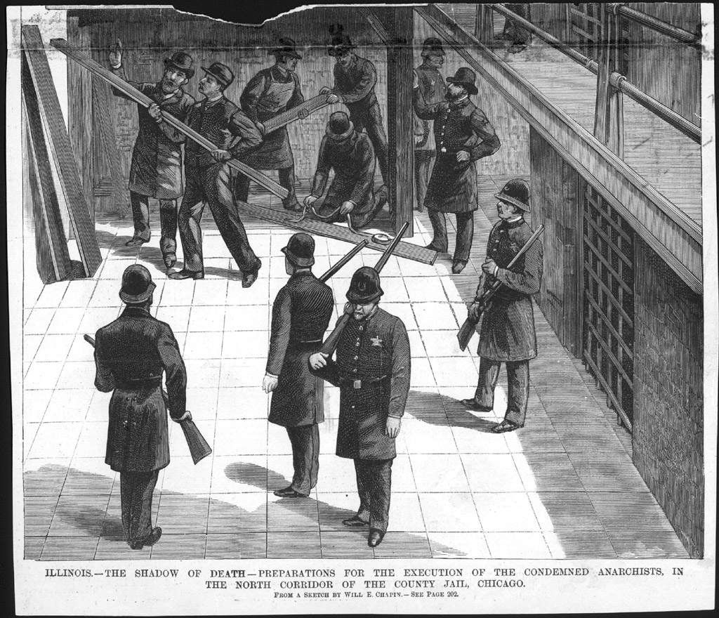The Shadow of death: preparations for the execution of the condemned anarchists, in the north corridor of the County Jail, Chicago.