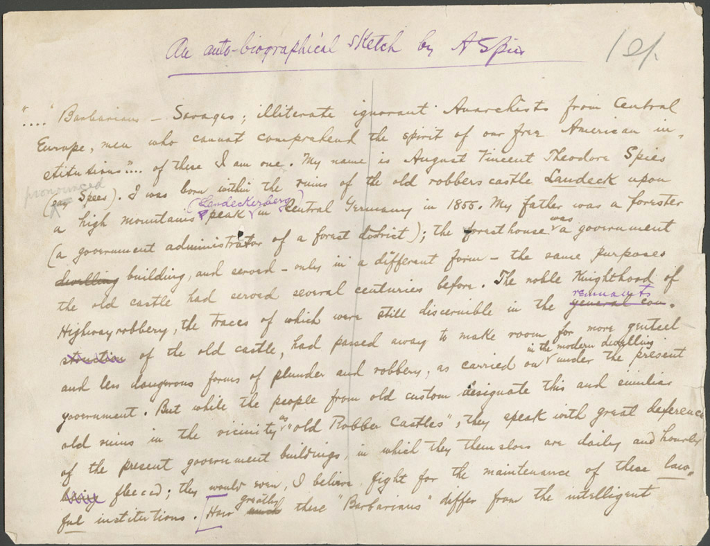 August Spies autobiography Page 1 Higher Quality Image (224K) | Next Image Return to Text | Return to Manuscripts TOC | Return to the HADC Table of Contents